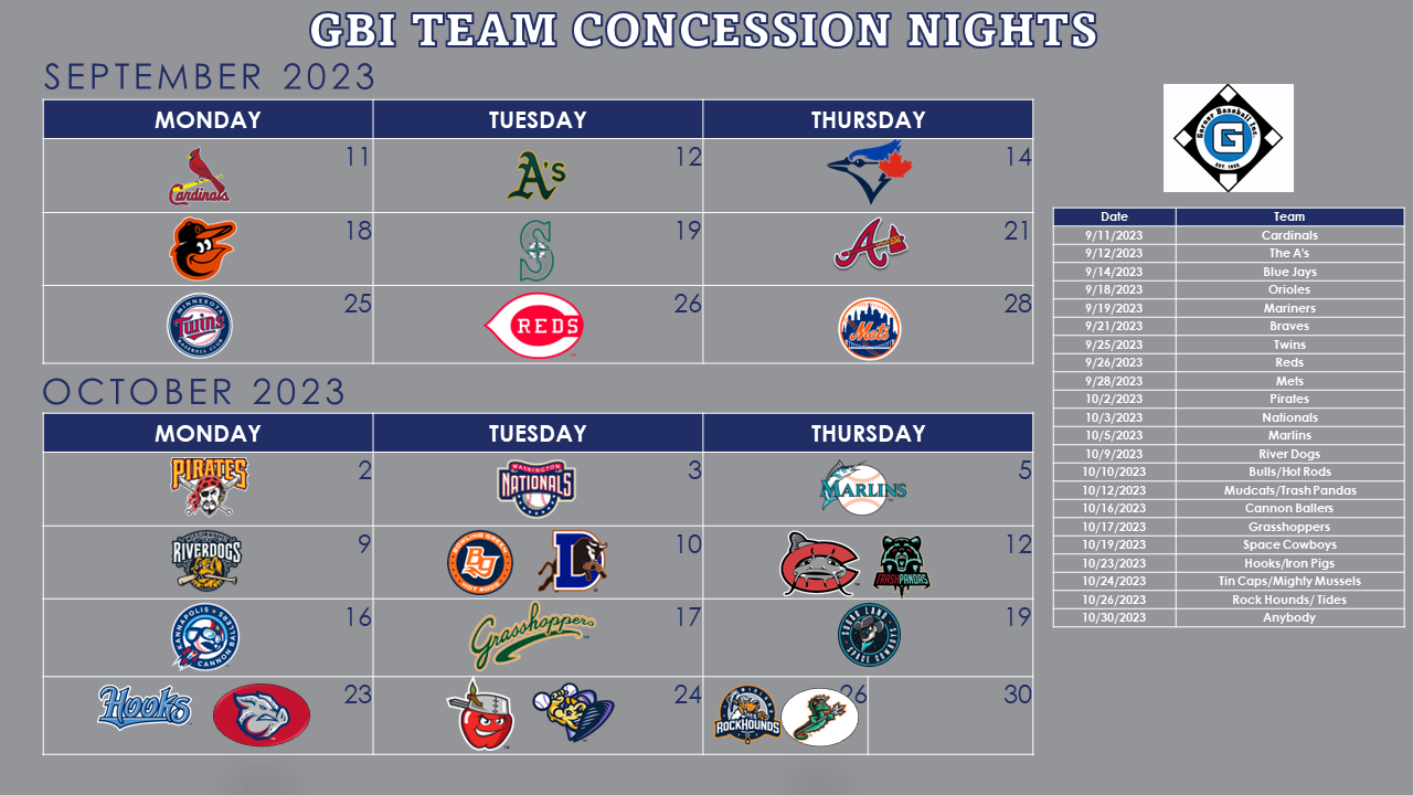 Thank you again for your participation and continued support of the players and families of GBI. Please don’t hesitate to reach out to Jim or Emily for any assistance throughout the season.Emily Johnson - Concessions DirectorJim Brewer - Asst. Concessions Director